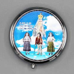 Caixa para comprimidos redonda em metal - Aparição e Basílica.Dimensão: 6cm diâmetro / 2cm alturaCódigo: 5215961391530..
