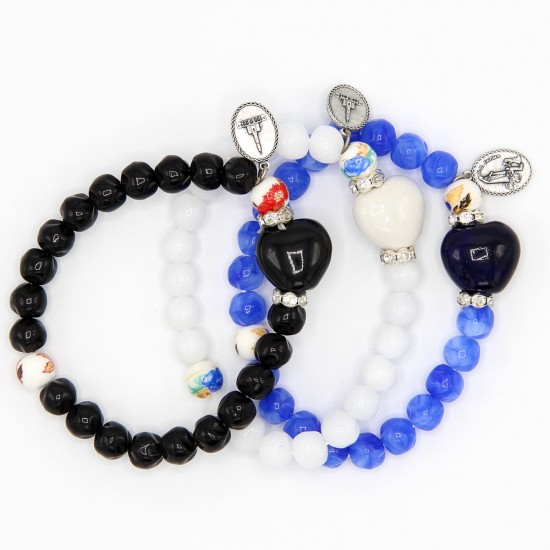 Conta central em forma de coração e medalha com Nossa Senhora de Fátima.